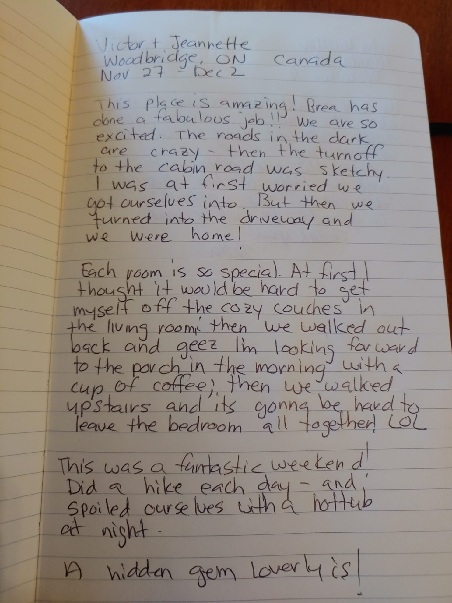 It is the most comfortable, cozy elegant, cabin . The bedroom alone had a large screen tv, gas fireplace, sitting area,..washer dryer..and wonderfully decorated…Most important, Brea and David were always in touch by phone , text and email. So much more I could say, but all the information is under description about the “cabin”.